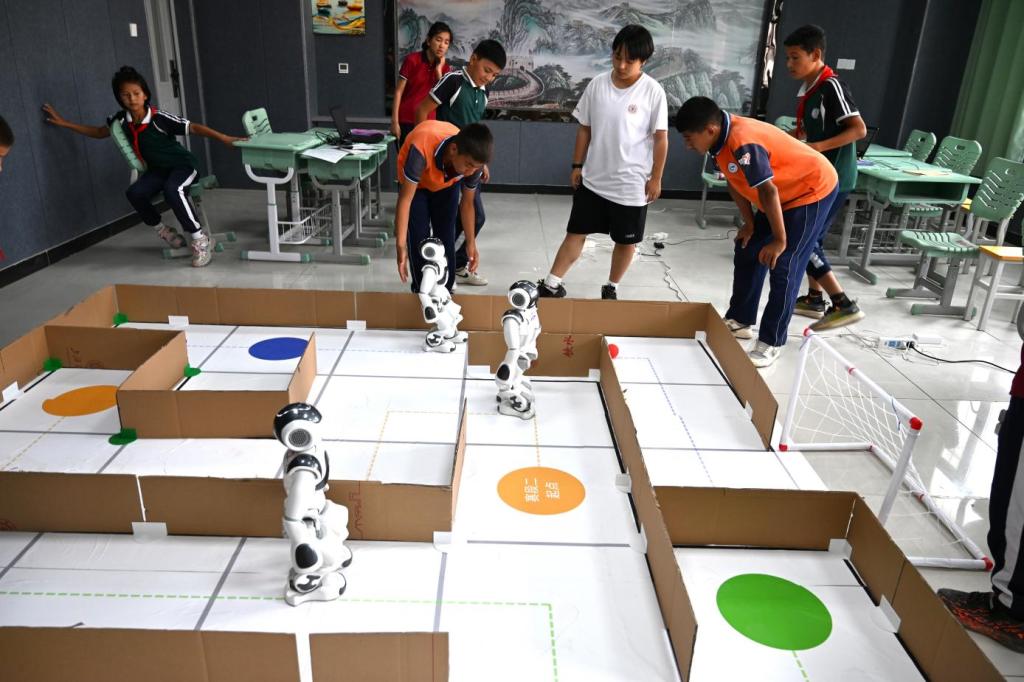 活动中,实践团为岳普湖县六中的学子呈现了一场科普盛宴。上海交大学生创新中心教务办主任、总工程师冷春涛教授主讲“具身智能机器人导论”,通过五大模块系统性地为学生们揭开人工智能的神秘面纱,激发学生创新兴趣。实践团还为100多名中学生开设了4门科创实践课程:“人形机器人迷宫探索编程开发”以迷宫挑战赛让学生沉浸式体验编程;“RoboCup小型足球机器人”和“强化学习训练AI仿真环境探索”通过竞技比赛和前沿算法训练,深化学生对人工智能核心原理的理解;“三维建模与3D打印”课程分设“创意设计”和“陀螺比赛”两个实践方向,锻炼学生的空间想象力与创新设计能力。